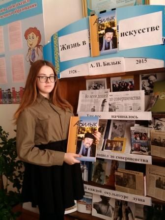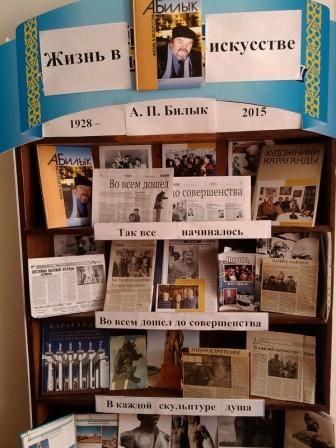 9 наурыз күні мектеп кітапханасында Қарағандының Құрметті адамы, өнерге еңбегі сіңген қайраткер, скульптор – мүсінші А.П. Билыктыеске алуға арналған іс шара өтті.