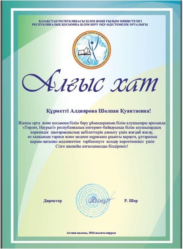 Жалпы орта және қосымша білім беру ұйымдарының білім алушылары арасында қашықтықтан өткізілген «Төрлет Наурыз!» республикалық интернет-байқаудан мектебіміздің 2 «А» сынып оқу…