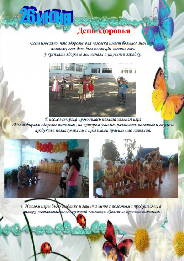 День здоровья. Всем известно, что здоровье для человека имеет большое значение, поэтому весь день был посвящён именно ему. Укреплять здоровье мы начали с утренней зарядки. А после завтрака пров…