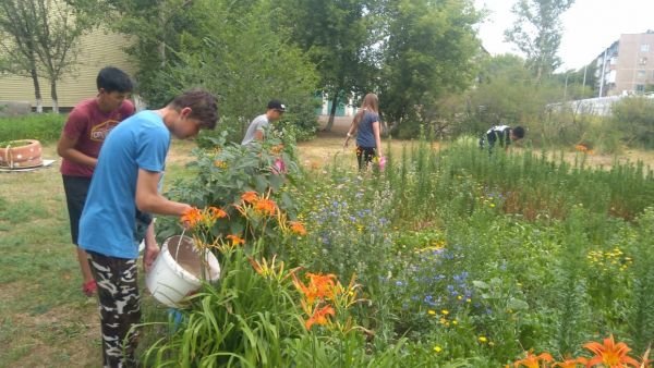 Несмотря на сильную жару, вопреки ветрам - суховеям цветы, благодаря стараниям ответственных школьников, продолжают цвести и радовать глаз.