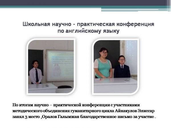 2018 жылы 30 наурызда мектепте төрт бағыт бойынша , 7-11 сынып оқушылары қатысқан «Ғылымдағы қадамдар-2018» атты ғылыми-практикалық конференциясы өтті. Олар :