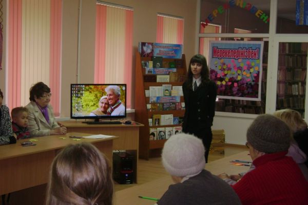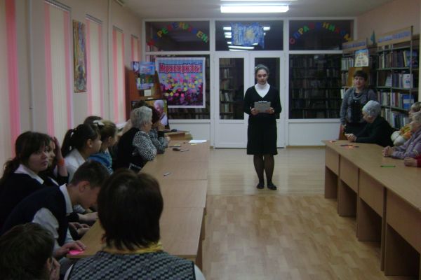 Просто мы вновь в библиотеке. Нет каждый из нас частый её гость. Но чтобы вот так всем классом, это... Да и представьте вместе с нами в библиотеке ветераны, пожилые люди. Произошла встреча поколений…