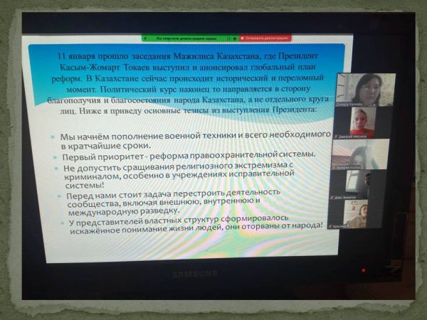 5 февраля 2022 года на платформе ZOOM состоялось совещание на тему: «Послание Президента Касым-Жомарта Токаева народу Казахстана”. На совещании учителя истории Муксинова Б.Ж. и Сатпенов А.Б. предоставили информацию о послании Президента народу Казахстана