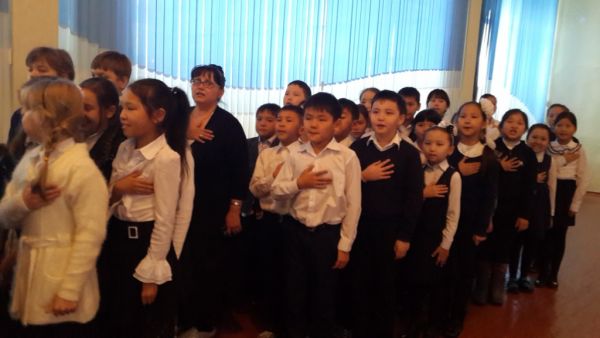 Сегодняшняя линейка, как всегда началась с исполнения государственного Гимна РК.