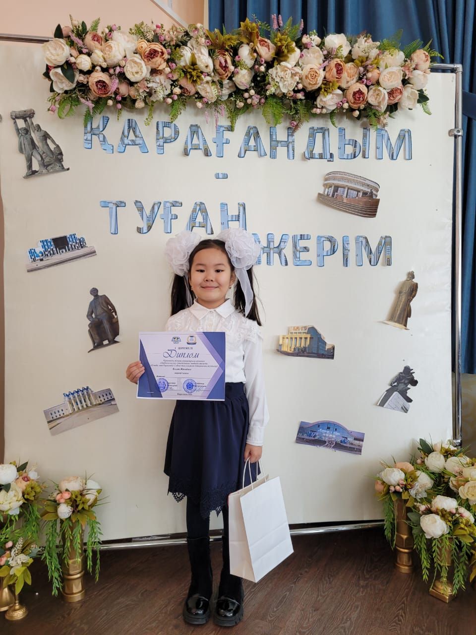 В областном конкурсе чтецов "О тебе, моя Караганда! ученица 3 "Ғ" класса Болат Жанайым заняла 1 место. Учитель Какетаева Г.К. Поздравляем Жанайым! Желаем ей новых достижений!