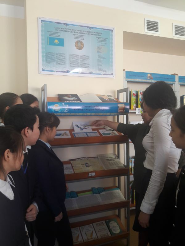 В библиотеке оформлена тематическая полка «Латын әліпбиі: Жаңғыру – жазудан басталады» . На эту тему проведена беседа среди учащихся 5-8 классов.