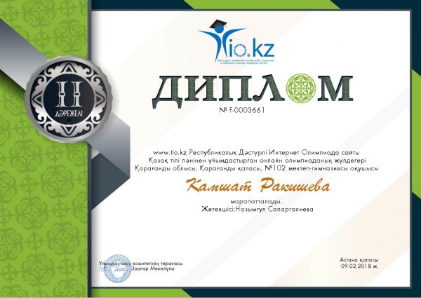 2 «Ғ» сынып оқушылары Республикалық Дәстүрлі Интернет Олимпиадаға қатысып пәндер бойынша 2 жүлделі дипломдармен және сертификатпен м…
