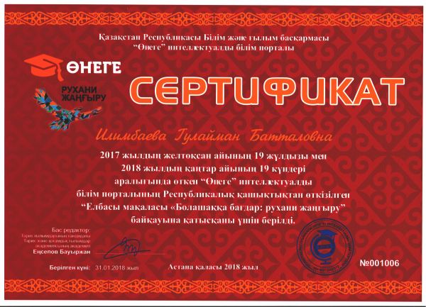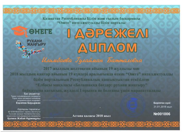 Ұстазымыз Илимбаева Гулайман Батталовна «Өнеге» интеллектуалды білім порталының Республикалық қашықтықтан өткізілген «Елбасы мақаласы Болашаққа бағдар: рухани жаңғыру»…