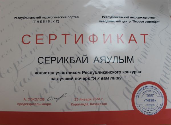 5 «А» сынып оқушысы Серікбай Аяулымды Республикалық ақпараттық-әдістемелік «Бірінші қыркүйек» орталығынан жүлделі сертификат алуымен құттыктаймыз!