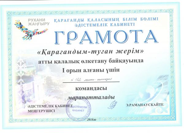 2018 жылдың 8-ақпанында өткен «Қарағандым – туған жерім» атты қалалық өлкетану байқауында 1 орын алғаны үшін 8 «В» сынып оқушылары Адамов Марлен, Кадыркулов Абдик…
