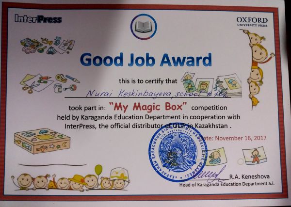 Қарағанды қаласында мектеп аралық 2-4 сынып оқушылар арасында ағылшын тілі пәнінен “My Magic Box” атты шығармашылық конкрус өтті. Біздің мектептен 4 “А” сынып оқушысы К…