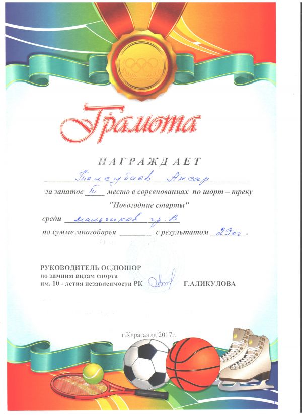 2 «Ә» оқушысы Төлеубаев Аңсар шорт – трек жарысына қатысып ІІІ жүлделі орынды жеңіп алды