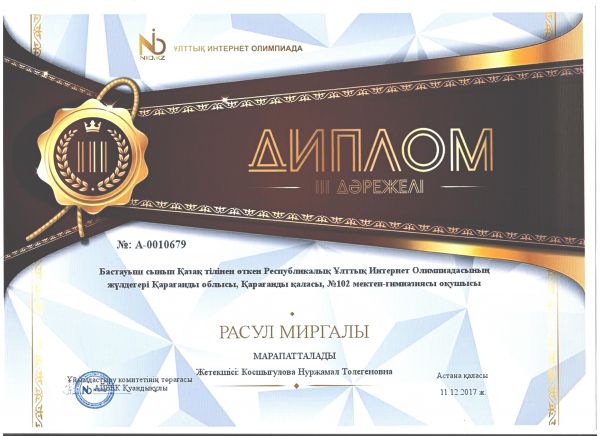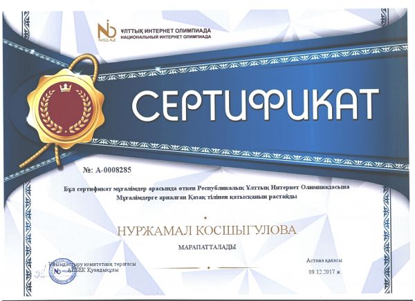 Қарағанды қаласының «№ 102 мектеп - гимназиясының» бастауыш сынып мұғалімі Косшыгулова Нуржамал Толегеновна Ұлттық Интернет Олимпиадасына жеңімпаздар дайындағаны үшін «Алғыс хатпен…