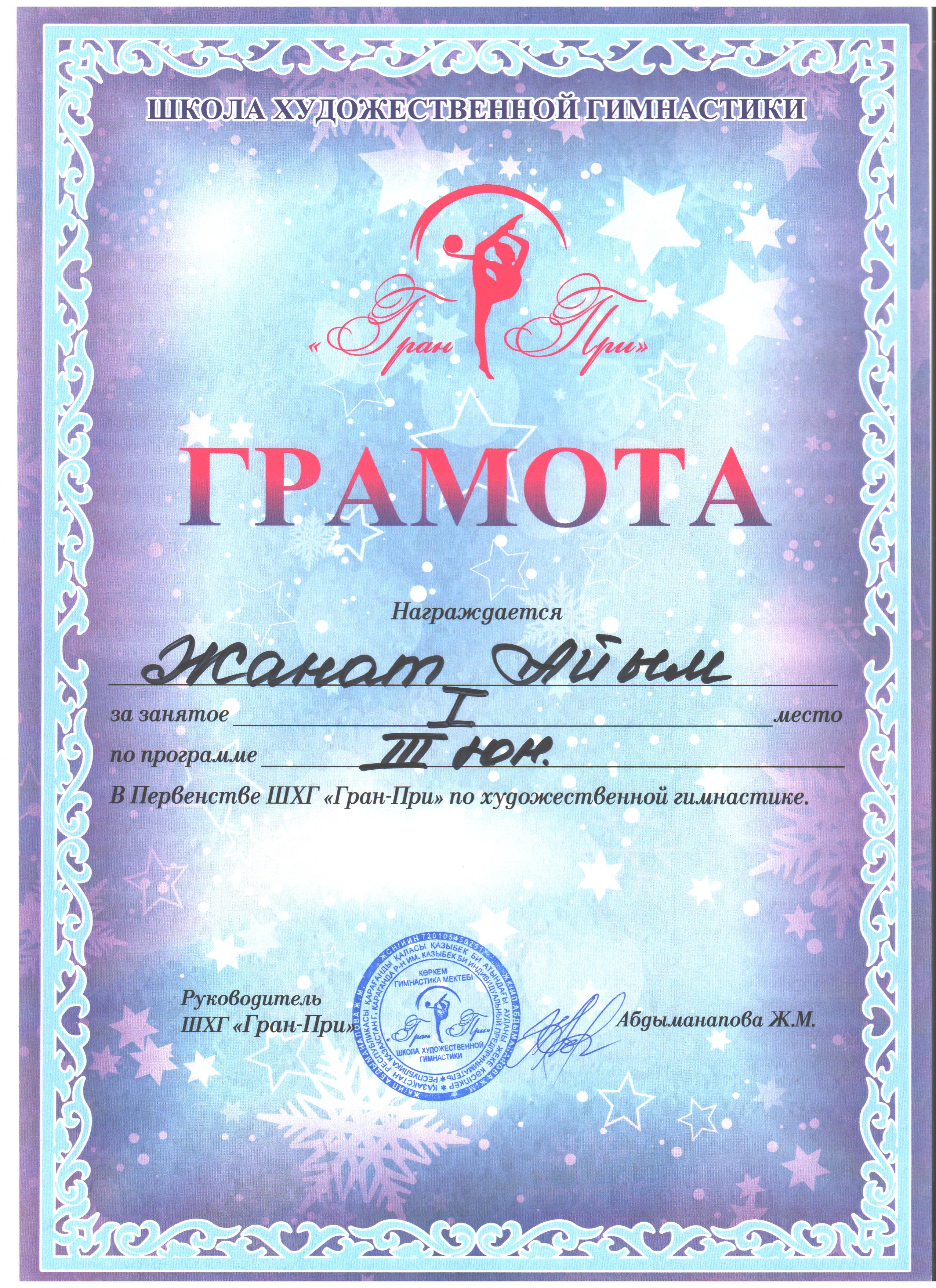 Грамота награждается Жанат Айым за занятое I место по программе III В Первенстве ШХГ “Гран-При” по художественной гимнастике.