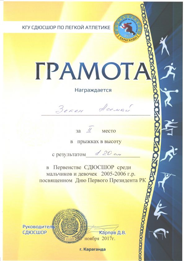 «№102 мектеп – гимназиясының» 6в сынып оқушысы Зекенова Әсемай Тұңғыш Президент күніне байланысты өткізілген қалалық сайысқа қатысып, жеңіл атлетикадан II о…