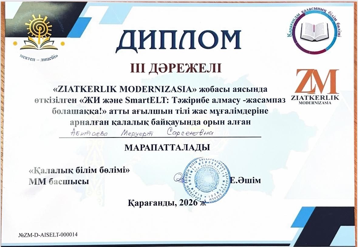 өткізілген «ЖИ және SmartELT: Тәжірибе алмасу - жасампаз болашаққа!» атты ағылшын тілі жас мұғалімдеріне