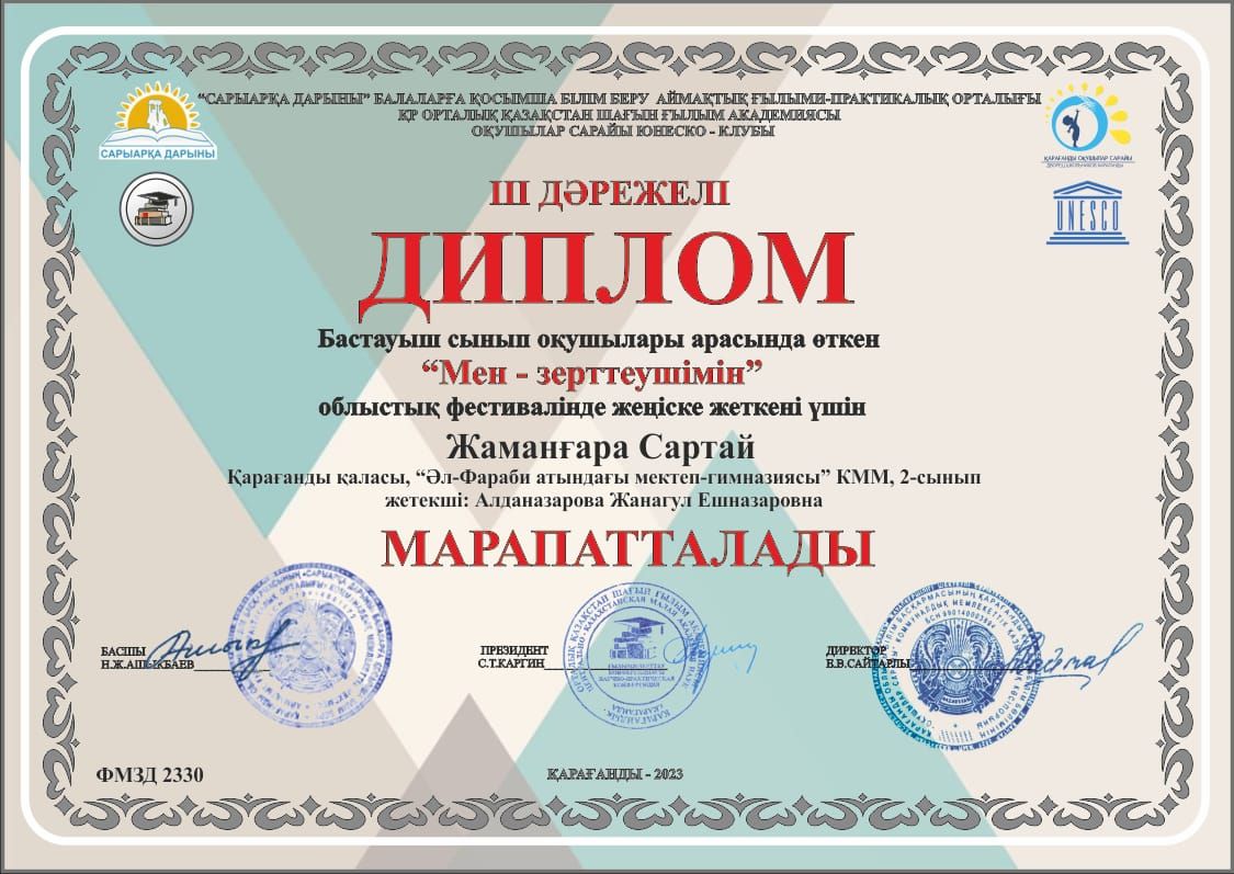 1 "В" сынып оқушысы Рахымтай Санжар классикалық шахматтан Қарағанды облысының Чемпионатына қатысып, І-орынға ие болды!