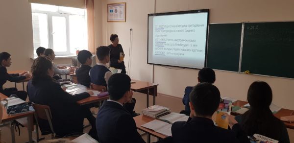 9 сынып оқушыларымен кәсіптік бағытта "Шет тілдер колледжі" ЖММ өкілі мамандықтар бойынша арнайы дайындап келген видеороликтер мен қосымша ақпаратармен бөлісті.