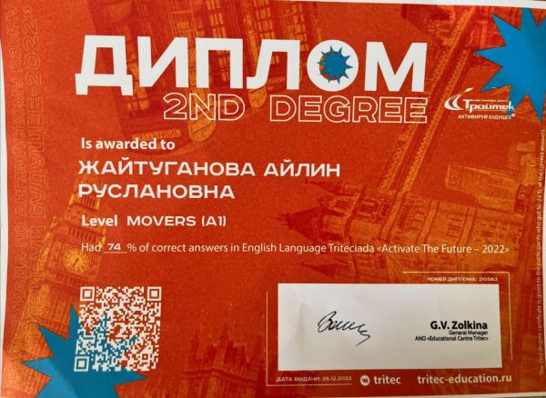 4 «Г» сынып оқушысы Жайтуганова Айлин қалалық ағылшын тілінен өткізілген "Болашақты белсендір – 2022" Трайтекиада олимпиадасына қатысып 2 орынды иеленді!
