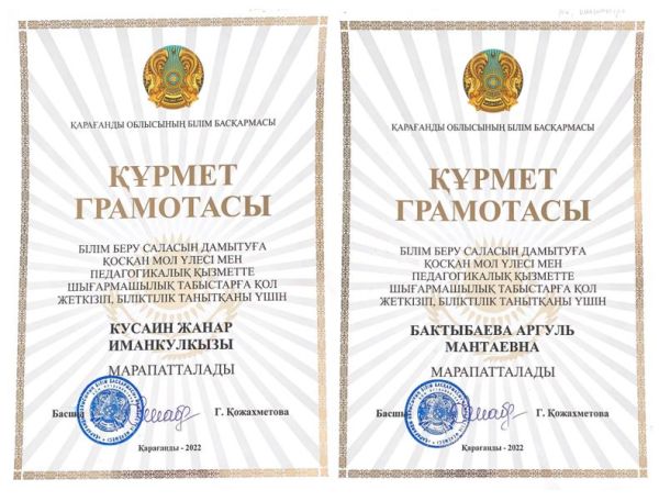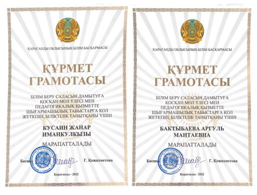 25 қазан Республика күніне орай мектеп-гимназиямыздың кітапханашылары Қарағанды облысы Білім басқармасының Құрмет грамотасымен марапатталды