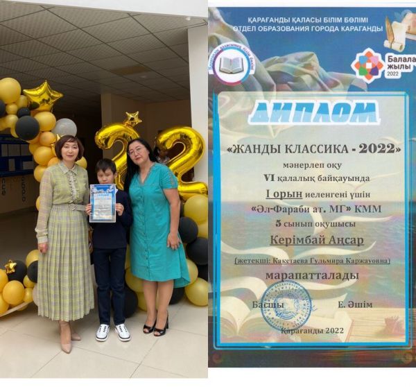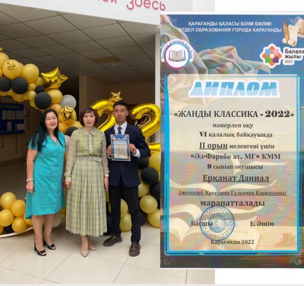Қарағанды қаласының білім бөлімінің ұйымдастыруымен 1 оқу жылы бойы бірнеше кезеңнен өткен "Жыл оқушысы-2022" байқауы нәтижесінде 11 "Ә" сынып оқушысы Қосымбек Эрика жүлдел…