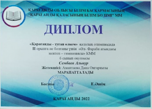"Қарағанды-туған өлкем" қалалық олимпиадасына 6- сынып оқушылары Сембаев Альнур ( жетекшісі: Амантаева Д.О.), Қазыбекова Адина (жетекшісі:Кокенова А.А.) , 5- сынып оқушысы Кашкимбаева Ками…