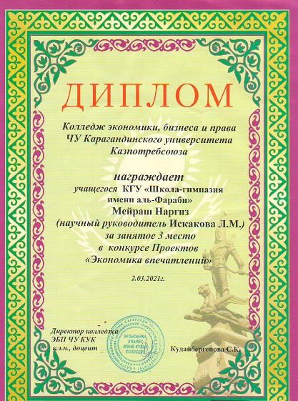 Әл-Фараби атындағы мектеп-гимназияның 11«А» сынып оқушысы-Елдосова Айтолкын Қарағанды қаласының Жастар Маслихатының II шақырылым депутаты сайланды. 19.03.21 күні Жастар Маслихатының Депу…