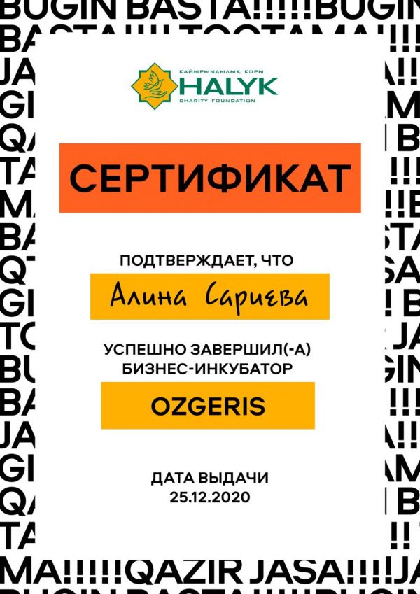 «№102 мектеп –гимназияның» 8 «Ә» сынып оқушысы Сариева Алина мектептегі «Бизнес стартап» жобасы аясында «Atameken Academy»
