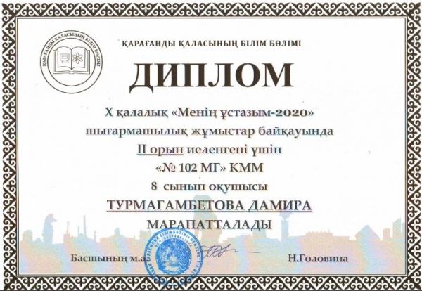 Х қалалық «Менің Ұстазым-2020» шығармашылық жұмыстар байқауында ІІ орын иеленгені үшін мектеп-гимназиямыздың түлегі Қайырбек Алуа, 9 сынып оқушысы Айтжанова Медина және 8 сынып оқу…