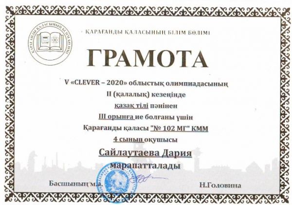 V «CLEVER – 2020» облыстық олимпиадасының ІІ (қалалық) кезеңінде 4 сынып оқушылар арасында пәндік олимпидасында І орын алған мектеп-гимназиямыздың 4 сынып оқушылары Ана…