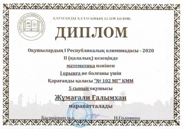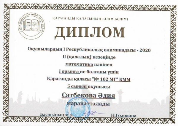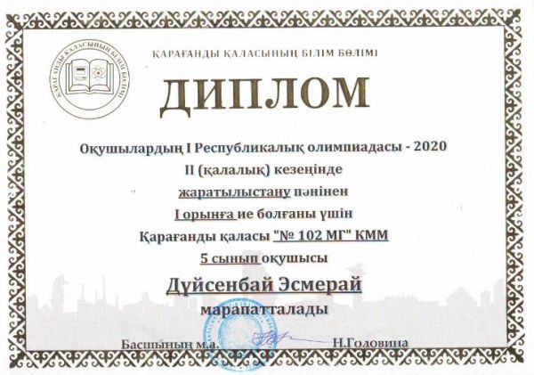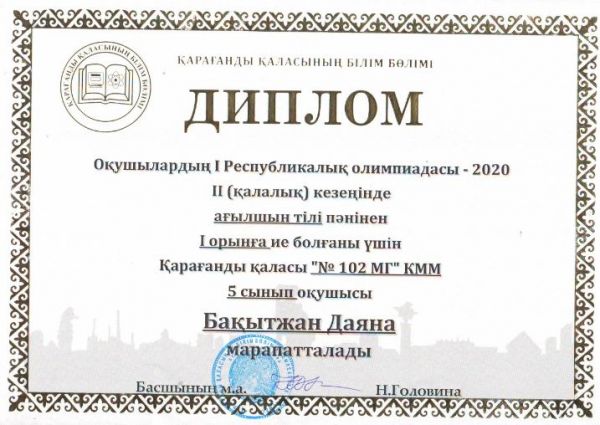 Оқушылардың І Республикалық олимпиадасы-2020 ІІ (қалалық) кезеңінде 5 сынып оқушылар арасында пәндік олимпидасында І орын алған мектеп-гимназиямыздың 5 сынып оқушылары Бақытжан Даяна, Мы…