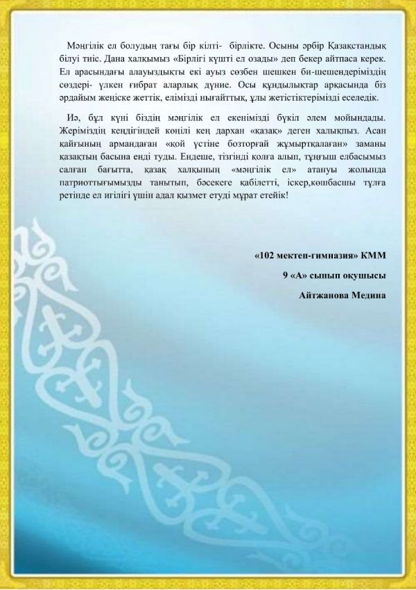 Қазақстан Республикасының Бірінші Президент күніне орай 9-11 сыныптар аралығында «Мәңгілік ел - ұлттық идея» тақырыбында эссе жазылды.