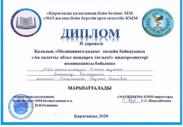 10 "А" сынып оқушысы Нариманқызы Әннурия ІІ дәрежелі дипломмен марапатталды