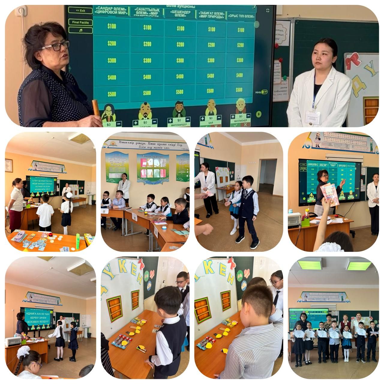 11 сәуір күні “Бастауыш сынып пәндерінде құндылыққа бағытталған білім беру“ тақырыбындағы онкүндік аясында 2 сыныптар арасында “Білім аукционы” атты қаржылық сауаттылыққа арналған ойын өткізілді. Ойын екі тілде жүргізіліп, оқушылардың функционалдық сауатт