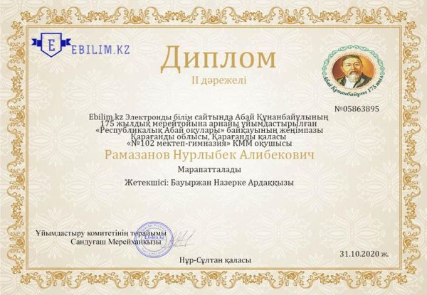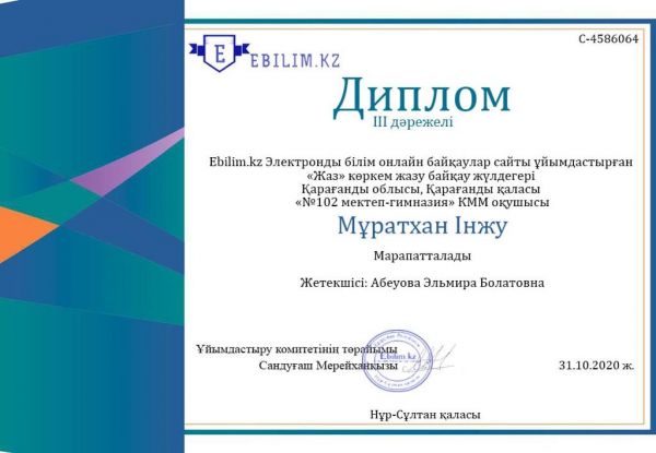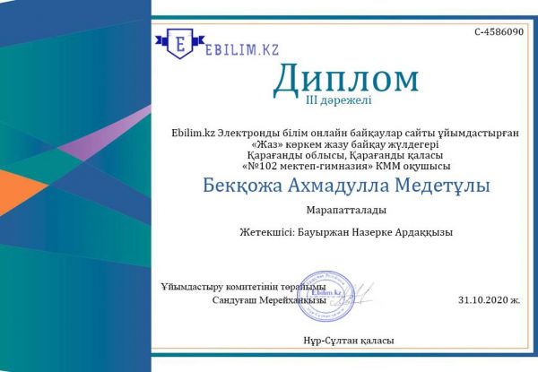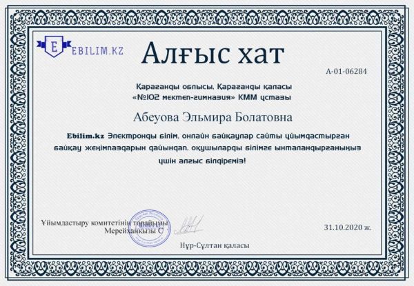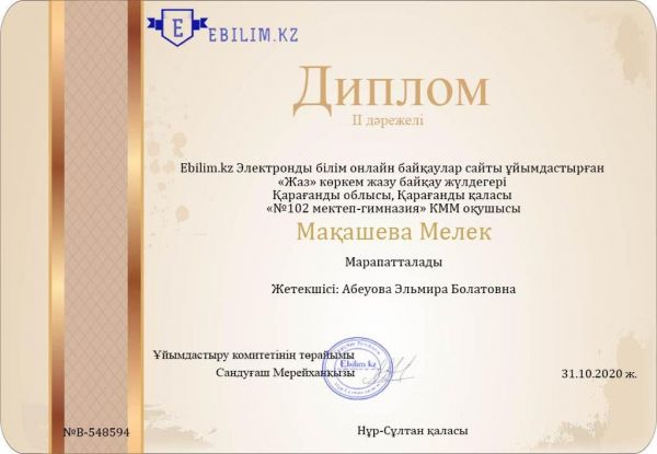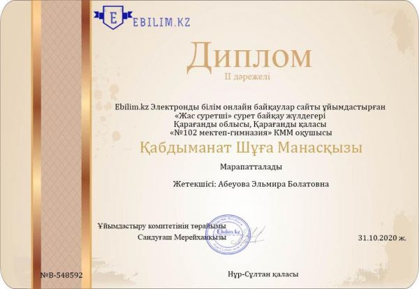 Ebilim.kz ұйымдастырған онлайн конкурсқа 1 "Г" сынып оқушылары қатысып, жүлделі орындарға ие болды. Сынып жетекшісі Бауыржан Н.А