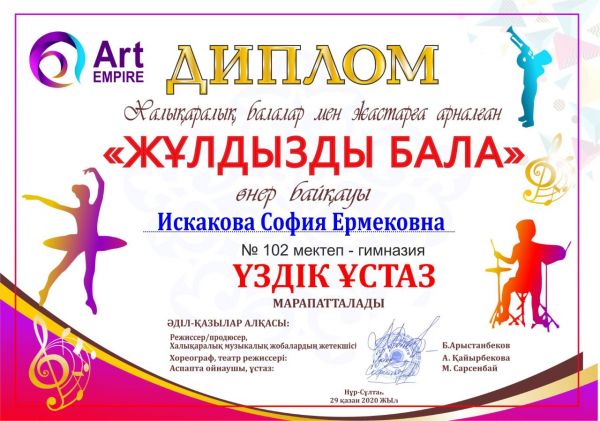 26-28 ҚАЗАН, 2020 ЖЫЛ «ЖҰЛДЫЗДЫ БАЛА» Республикалық онлайн байқауы болып өтті. Байқаудың мақсаты: балалар мен жас өспірімдердің таланттарын және көркем шығармашылыққа қызығушылықтарын арттыру. Атал…
