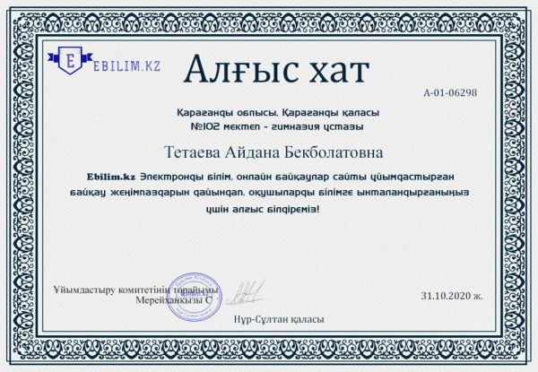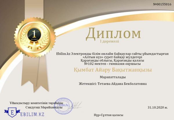 Ebilim.kz сайты ұйымдастырған байқауға оқушылар қатысып, І, ІІ, ІІІ дәрежелі дипломдарымен марапатталды. Жеңімпаздарды құттықтаймыз!