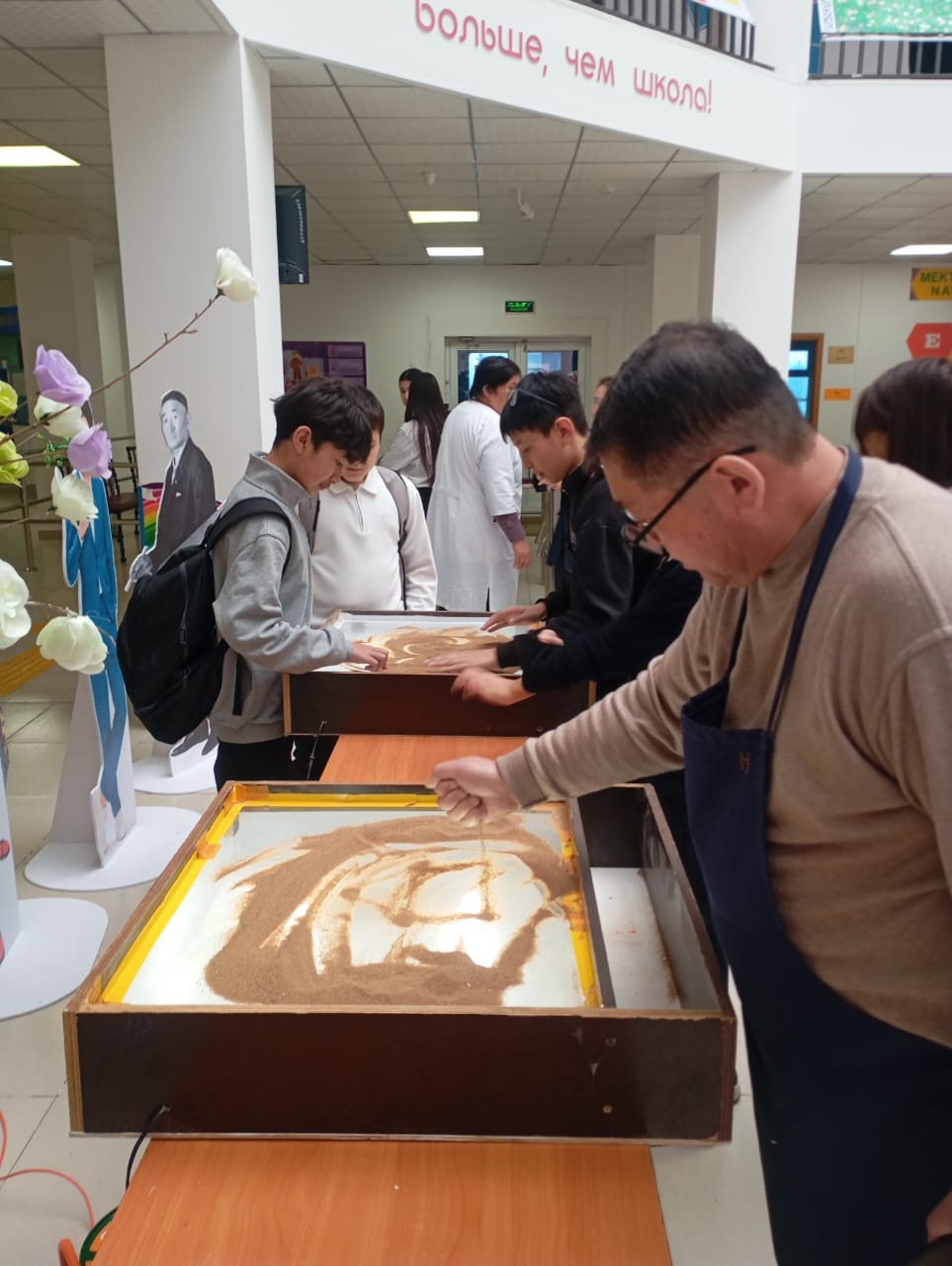 В рамках декады эстетической кафедры во время перемен прошел конкурс “Рисование песком”.Дети активно учавствовали и отобразили свои мысли в песке.Организовал учитель технологии Сабитов К…