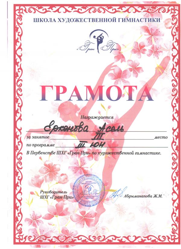 Еркенова Асель ученица 1 "Г" класса награждена грамотой за занятое 3- место в Первенстве ШХГ "Гран- ПРИ" по художенственной гимнастике.