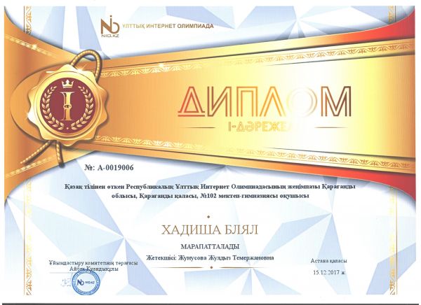 Ученица 8 "Ә" класса школы-гимназии 102 Блял Хадиша награждена дипломом 1 степени в Республиканском Национальном Интернет Олимпиаде.