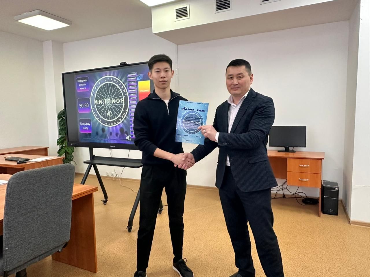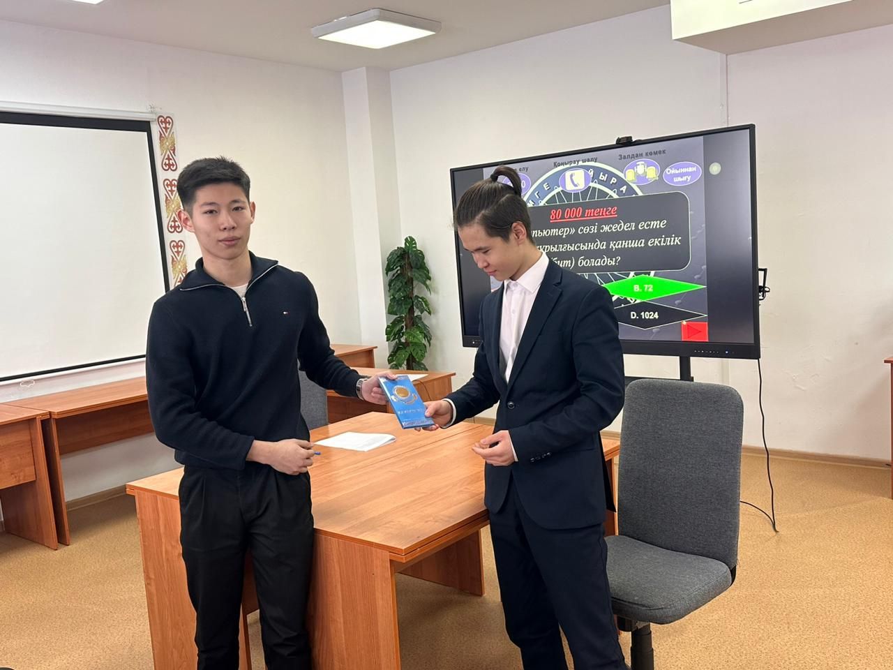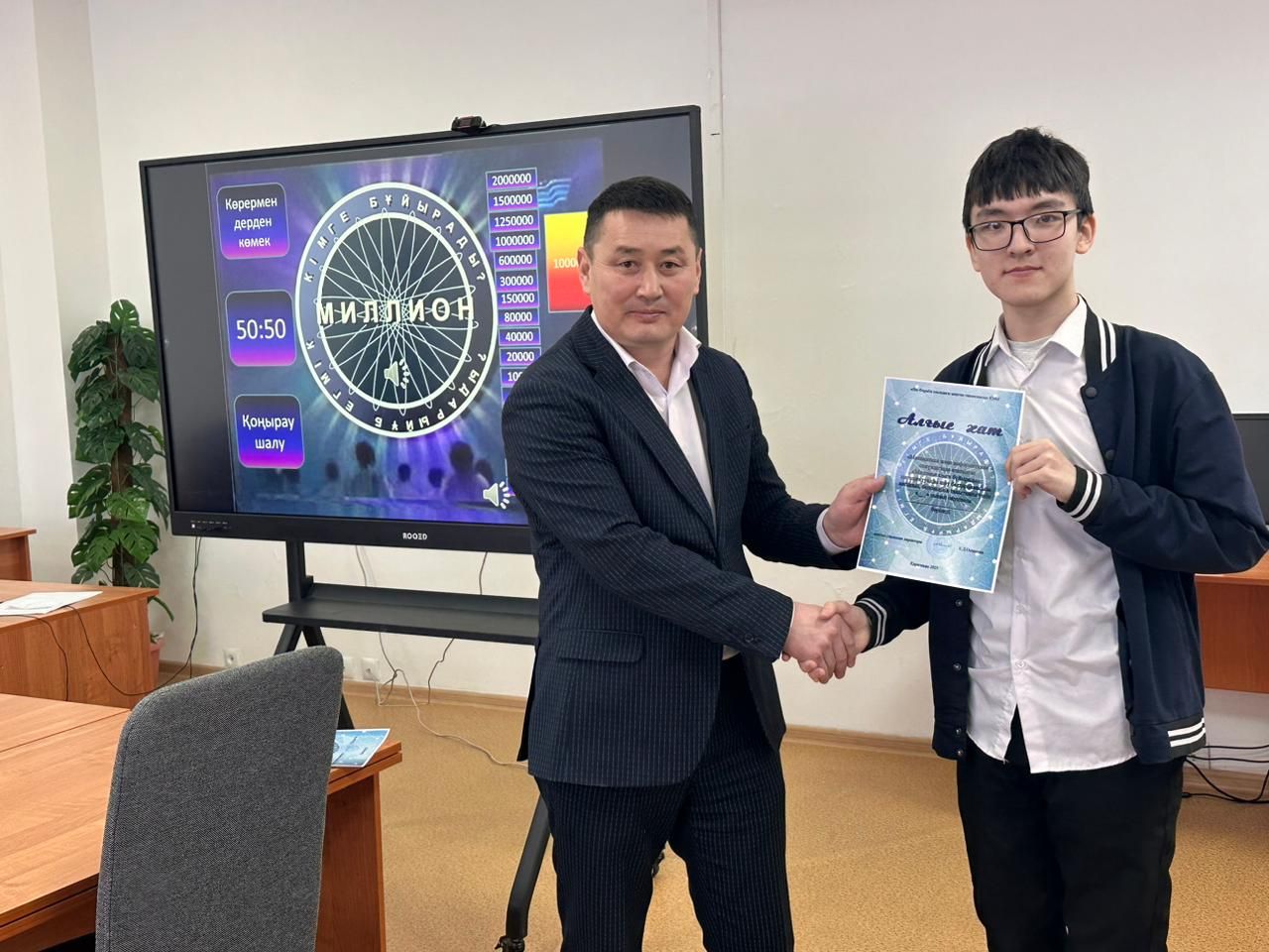 28 қаңтар күні “Математика және информатика” онкүндігі аясында “Миллион кімге бұйырады?” Интеллектуалды шоу бағдарламасы 10-сыныптар арасында Ахметов Думан Жумашевич және Бля…