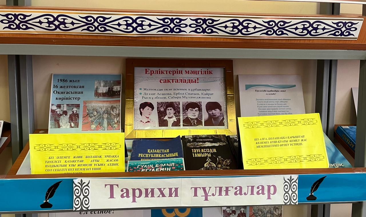 “Тәуелсіздік - елімнің ерлік жолы” тақырыбында кітапханада тақырыптық көрме ұйымдастырылды. Сонымен қатар “Тарихи тұлғалар” желтоқсанның құрбандандарына кітап-суреттік экспозициясы ұйымдастырылды.