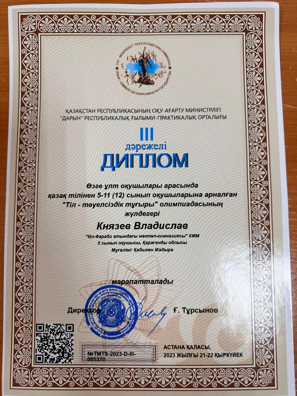 Әл-Фараби атындағы мектеп-гимназиясының 5”Г” сынып оқушысы Князев Владислав Тіл-тәуелсіздік тұғыры” атты олимпиадасында қазақ тілінен 3-дәрежелі дипломмен марапатталды.
