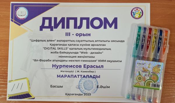 Қалалық «DIGITAL SKILLS» мультимедиалық жоба байқауында «Web-дизайн» номинациясы бойынша 9 «В» сынып оқушысы Нурпеисов Ерасыл ІІІ орын иеленді.