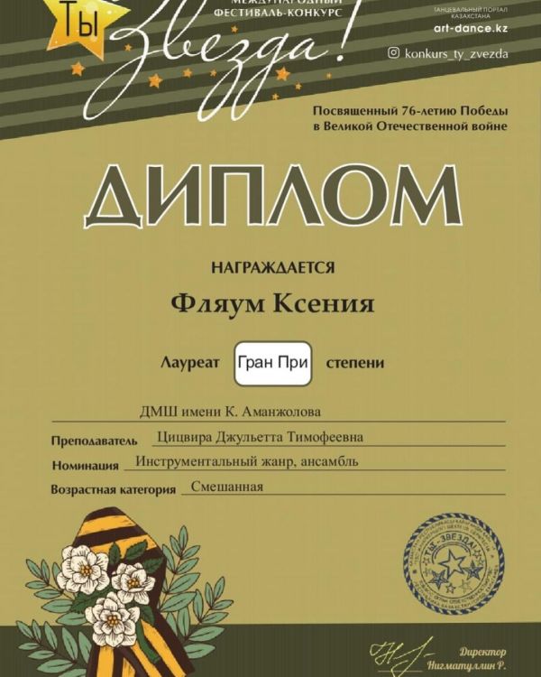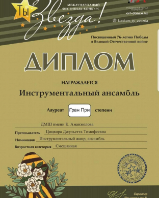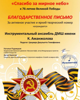 Благодарственное письмо за активное участие и яркий творчески номер в Международном творческом марафоне «Спасибо за мирное небо» посвящённый 76-летию Великой Победы инструментальному анс…