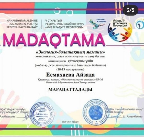 6 открытый республиканский конкурс «Мир в радуге профессий» в номинации «Экология – профессия будущего юннаты КГУ «Станция юных натуралистов» Абушакимова А. и Есм…