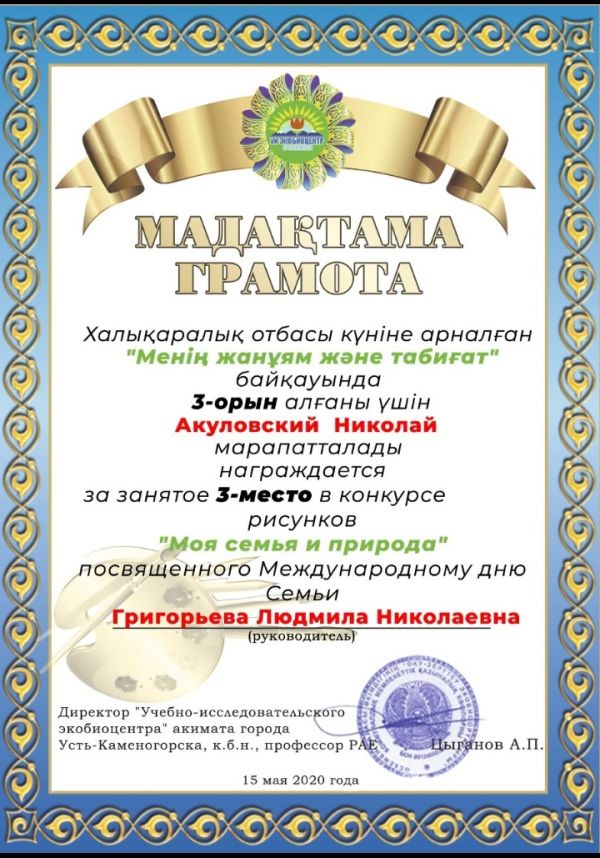 Наши ребята с группы "Бақыт" участвовали в онлайн конкурсе рисунков на тему "Моя семья и природа", посвященная Международному дню семьи". По итогам конкурса: 2 место занял П…