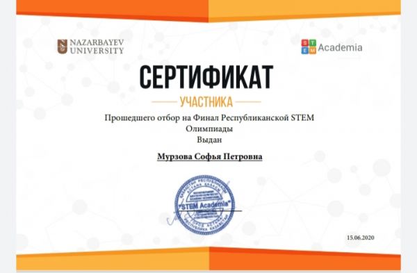 Поздравляем победителей Республиканской олимпиады Stem. Куценко А., Мурзова С.Дети прошли на финал скоро в город Нур-султан.