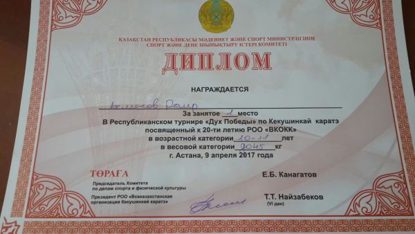 Поздравляем Ахметова Даира, ученика 5 А класса, за занятое 1 место в Республиканском турнире «Дух Победы» по Кекушинкай каратэ, посвященном 20-летию РОО «…