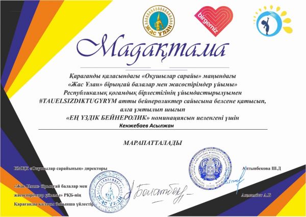 "Тәуелсіздік тұғыры" атты қалалық сайыста ерекше көзге түскен "Ең үздік бейне бейнеролик"атты номинацияны жеңіп алған #97 гимназияның 1 "Ә"сынып оқушысы Кенжеб…